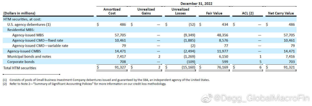 我們知道商業銀行買固收產品大多是以可供出售(AFS)和持有至到期(HTM)來做會計處理的。SVB 也不例外。其 160 億的美債完全以 AFS 計量,而 1000 億的 MBS 主要是以 HTM 來計量(圖 5)。AFS 和 HTM 的好處是,資產市值(mtm)的波動不會直接反映在損益(profit and loss)上,至多影響其他綜合收益(OCI)下的未實現損益,而且可以轉回。但缺點是,一旦被迫出售 AFS 和 HTM,就需要在當期確認一筆損益。
