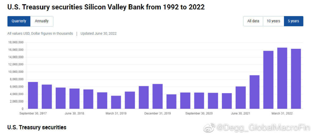 2020 年下半年疫情擔憂褪去後而美聯儲仍在承諾維持 0 利率很長時間,量化寬鬆持續進行,通膨也見不到影子,全球迎來了科技企業的融資熱潮期,startups 貸款和風投額度的快速增長使科技初創企業手裡積累的大量的現金和存款,而這些存款很大程度流入了 Silicon Valley Bank(下簡稱 SVB)這一矽谷最重要的、也是全美前 20 大的銀行。2020 年 6 月至 2021 年 12 月的一年半期間,SVB 的存款由 760 億美元上升到超過 1900 億美元,增幅接近 2 倍(圖 1)。