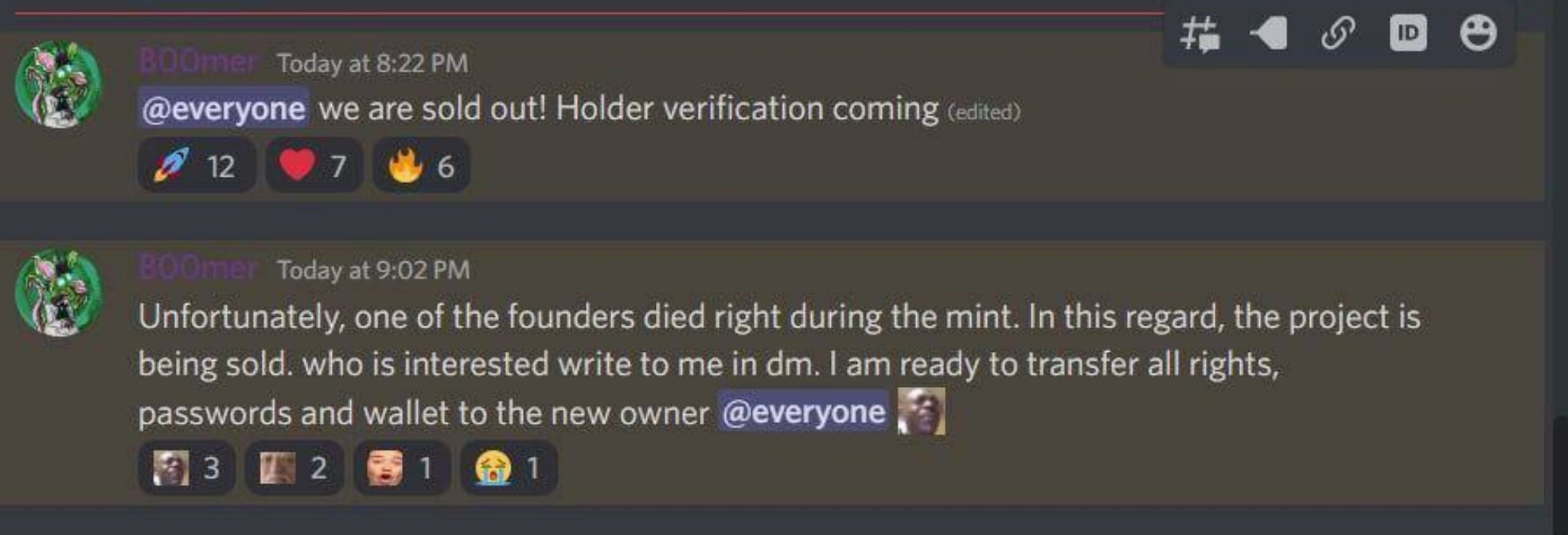 這張由 @Forculus 和 @tropoFarmer 發布的 Discord 截圖,裡面對話串先是 NFT 項目的 Mod 致謝所有成員,表示「項目首發全數賣完,持有者認證即將上線」,但過了四十分鐘,下一句公告來得令人猝不及防: