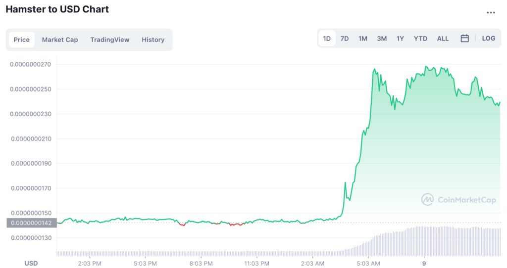 與 Mongoose Coin 不同,另一個被議員提到的倉鼠幣(HAM)也應聲上漲(在他發表評論之前就已經存在),據 Coinmarketcap 數據,代幣價格從會議開始前的低點 0.00000001471 最高上漲到 0.00000002644,24 小時內上漲 67.75%。