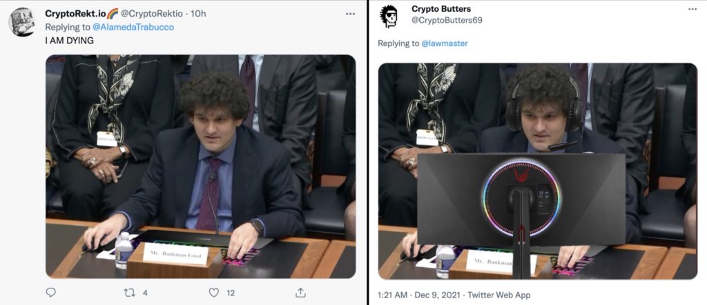 在昨晚舉辦,探討數位資產未來的聽證會上。議員 Brad Sherman 砲轟 Coinbase 執行長、Tether 未出席,警告監管應提前部署,其開玩笑提到的代幣應聲上漲 3200 倍。另外,Alameda Research 執行長在推特上傳現場 SBF 照片發文:「信不信由你,他在參與會議的同時也在玩英雄聯盟。」結果引起網友腦洞大開的發出惡搞照,打趣的讓 SBF 彷彿真的在玩遊戲。