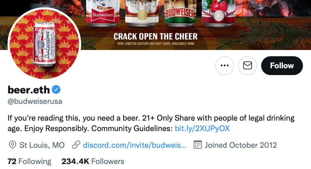 近期我們可以看到多家大型企業紛紛表態進軍區塊鏈相關應用的野心,除了 Tobi 之外,知名啤酒品牌「百威」也在 8 月下旬購買了 ENS 域名 Beer.eth,並同樣修改家為其官方 Twitter 名稱。