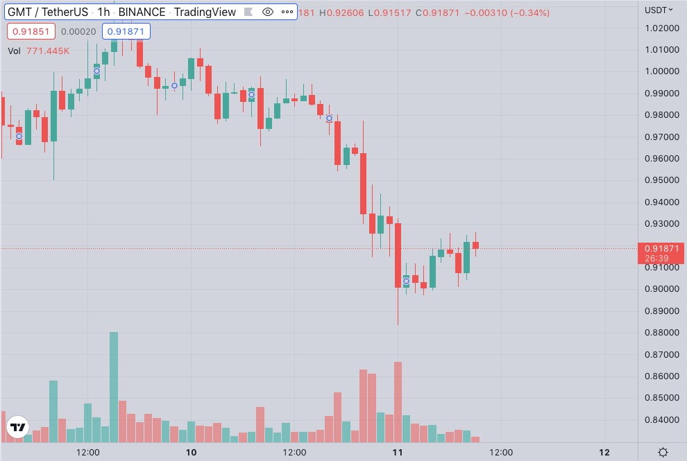 GMT 幣價則在公告後,5 小時內大跌至本月低點 0.884 美元, 最深跌幅達 9.5%,截稿前略有回溫,報 0.919 美元