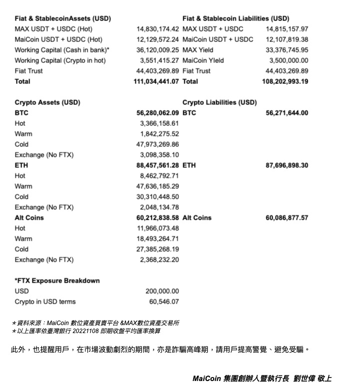 「 FTX 事件並未對 MaiCoin 數位資產買賣平台 與 MAX 數位資產交易所之營運造成衝擊。」