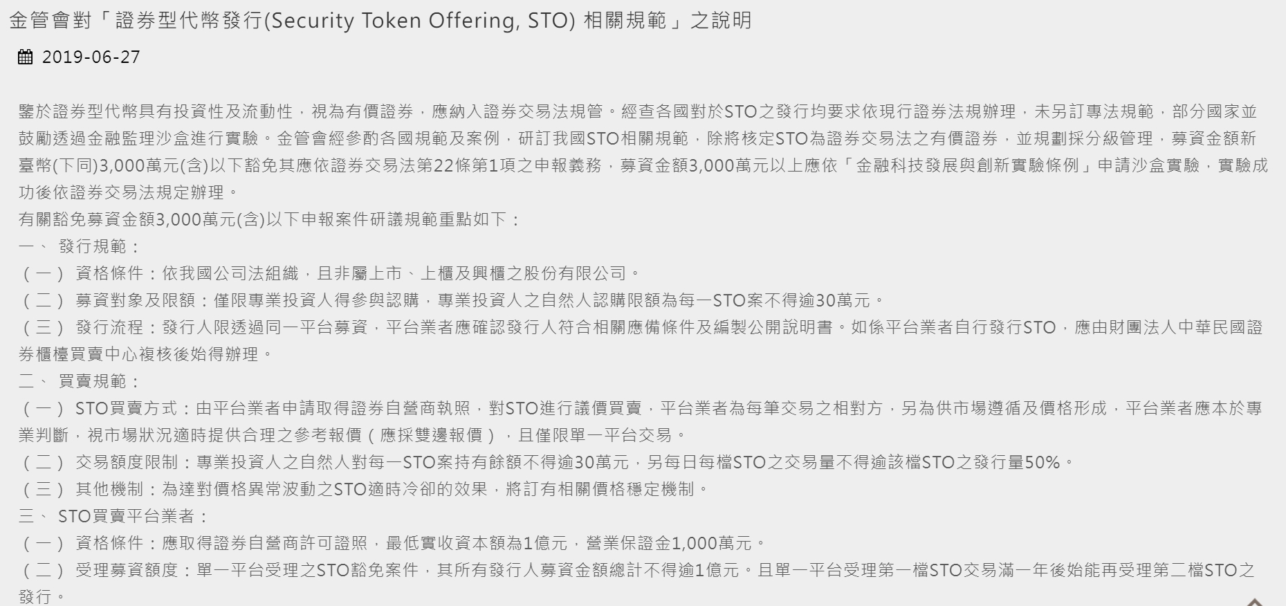 金管會在 2019 年發布 STO 規範,採分級管理,以募資金額新台幣 3,000 萬元為分野, 3,000 萬以下的募資案豁免證交法第 22 條第 1 項申報義務,3,000 萬以上則依照監理沙盒實驗,視實驗結果按證交法辦理。