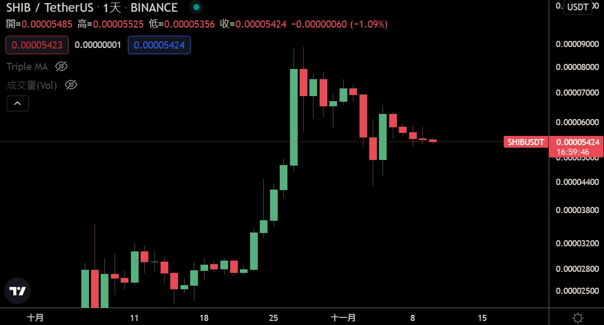 柴犬幣(SHIB)在上月迎來瘋狂漲勢、於 10 月 28 日觸及歷史新高的 0.00,008,854 美元後,幣價表現開始轉弱。至截稿前,報 0.00,005,421 美元,較歷史高點跌幅已達 40% 以上。