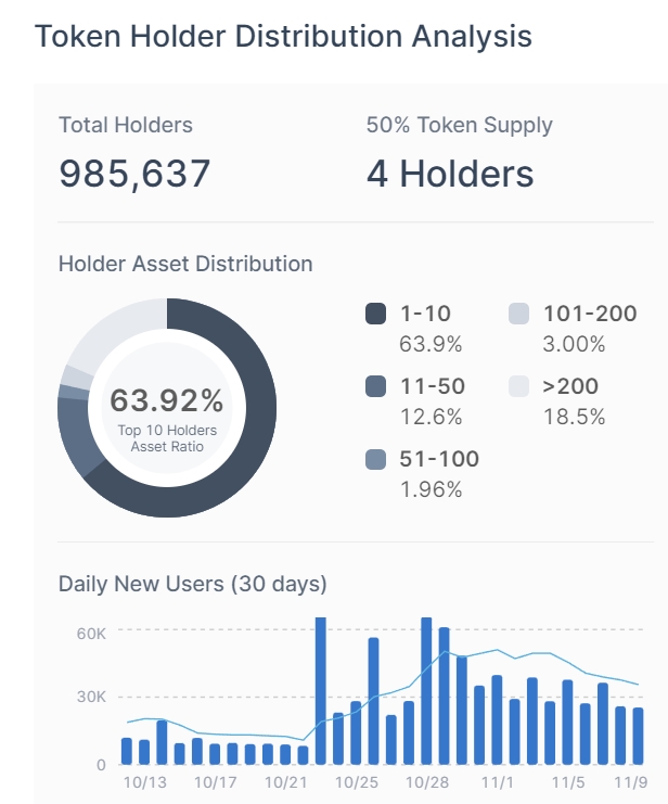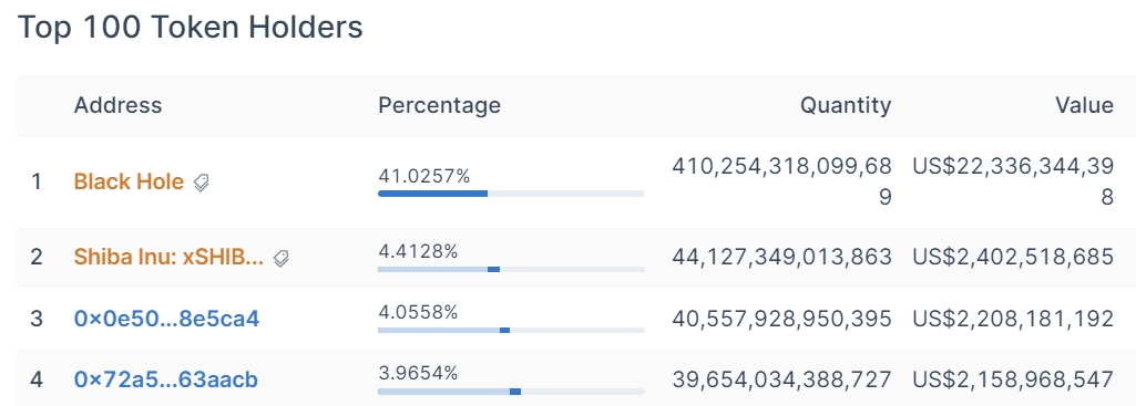 第一,是柴犬幣的流通供應量高度集中。 Etherscan 數據顯示,高達 63.6% 的現有供應量由 10 個錢包地址所持有。Certik 數據也顯示,柴犬幣現有供應量的 53.9% 由 4 個錢包地址所持有,如果這些巨鯨中的任何一個人決定賣掉所持有柴犬幣的一大部份,將會對柴犬幣價格構成巨大的風險。