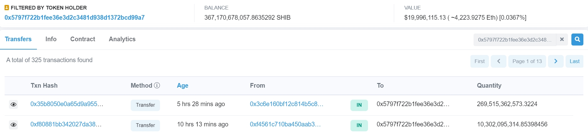 Etherscan 數據顯示,該地址當前持有約 3,671 億顆柴犬幣,現價將近 2,000 萬美元,這名巨鯨的舉措,可能會牽動柴犬幣的價格走勢。