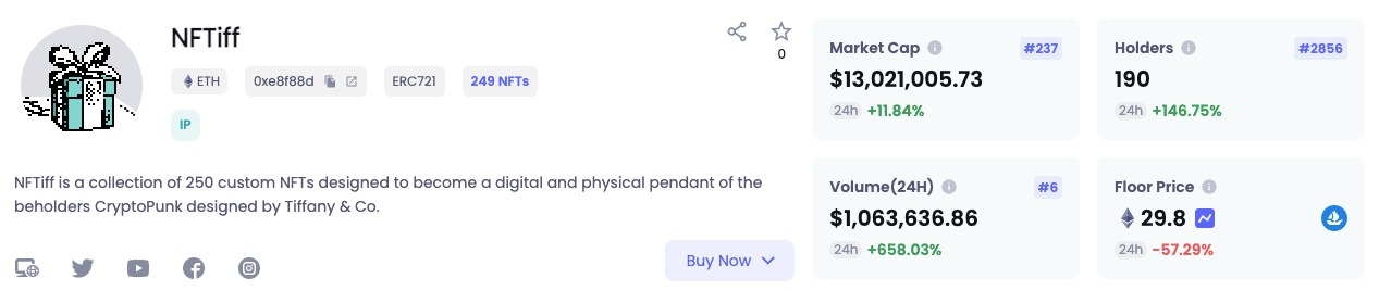 美國著名珠寶品牌蒂芙尼(Tiffany)在本週 1 日宣布推出品牌首個 NFT 項目 “NFTiff”,限量 250 個、售價 30 ETH,任何持有 Cryptopunks 的用戶只要購買該 NFT,就可依持有的 punks 兌換獨一無二的訂製寶石吊墜以及與珠寶類似設計的 NFT 。