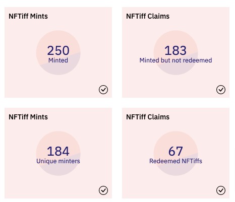 根據用戶@0x_catherine 透過 Dune Analytics 所整理關於 NFTiffs 的鏈上數據,250 個 NFTiffs 由 184 個獨立錢包鑄造,但當前僅有 67 個已選擇兌換成寶石吊墜。