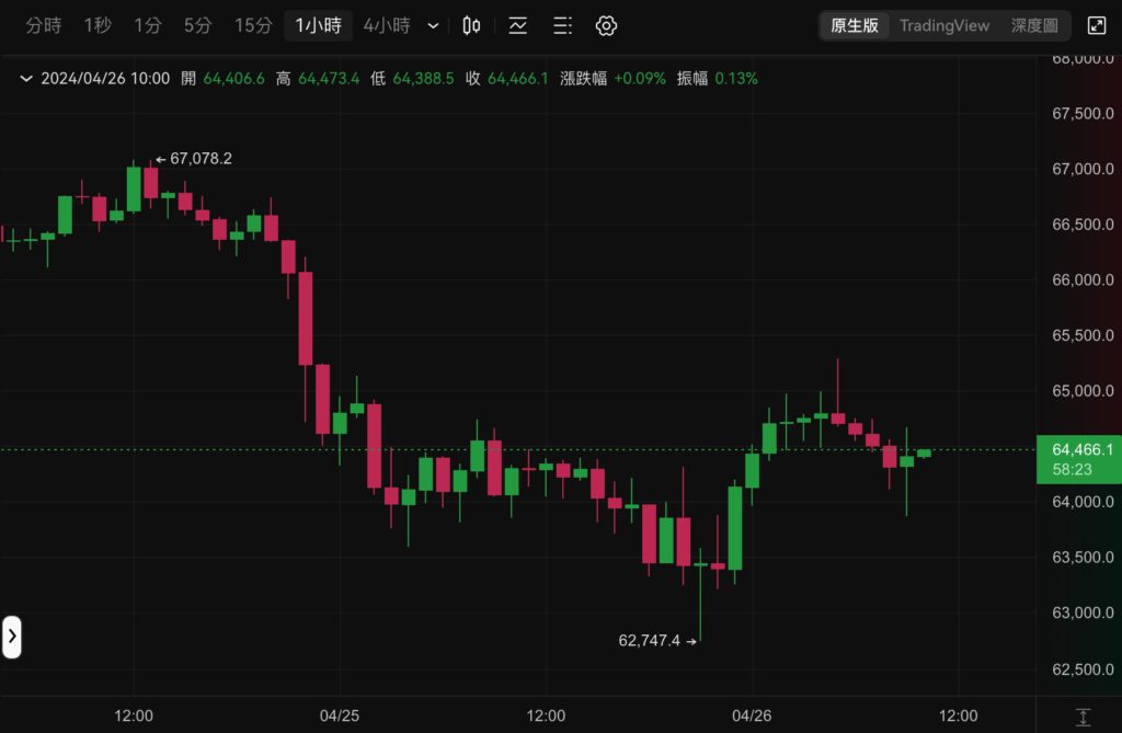 低於預期的 GDP 與依舊嚴峻的通膨數據出來後,比特幣在昨晚九點多一度插針 62,747 美元,不過很快又拉回上漲,撰稿當下現報 64,466 美元,近 24 小時上漲 3.4%。