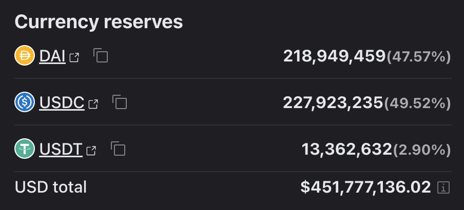 Curve 數據顯示,USDC/USDT 有超過 2 % 的脫鉤,Curve 3pool 也發生明顯比例傾斜,截稿前 USDT 佔比驟降至 2.9%,而 USDC 和 DAI 佔比分別上升至 49.52%、 47.57%。