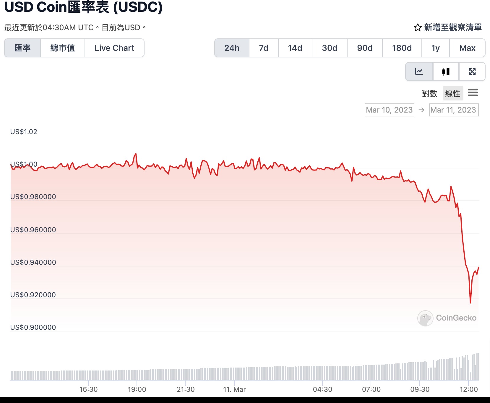 矽谷銀行暴雷持續延燒 USDC,CoinGecko 數據顯示,USDC 脫鉤稍早一度擴大至逾 8%,下探 0.9171 美元,截稿前暫報 0.9322 美元;以 USDC 抵作為抵押品(佔比近 40%)的去中心化超額抵押穩定幣 DAI 也脫鉤逾 5%,現報 0.945 美元。
