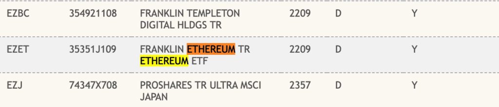 而在幾週前,另一家資管巨頭 Franklin Templeton 的現貨以太坊 ETF「FRANKLIN ETHEREUM TR ETHEREUM ETF」(代碼為 EZET)也同樣已在 DTCC 列出,創建 / 贖回(Create/Redeem)一欄顯示為 Y。