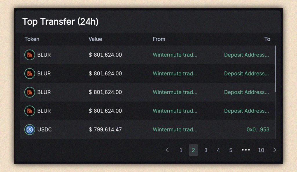 Wintermute 在空投前後將 500 多萬美元的 BLUR 存入了幾個交易所的存款地址(可能是倒貨)。