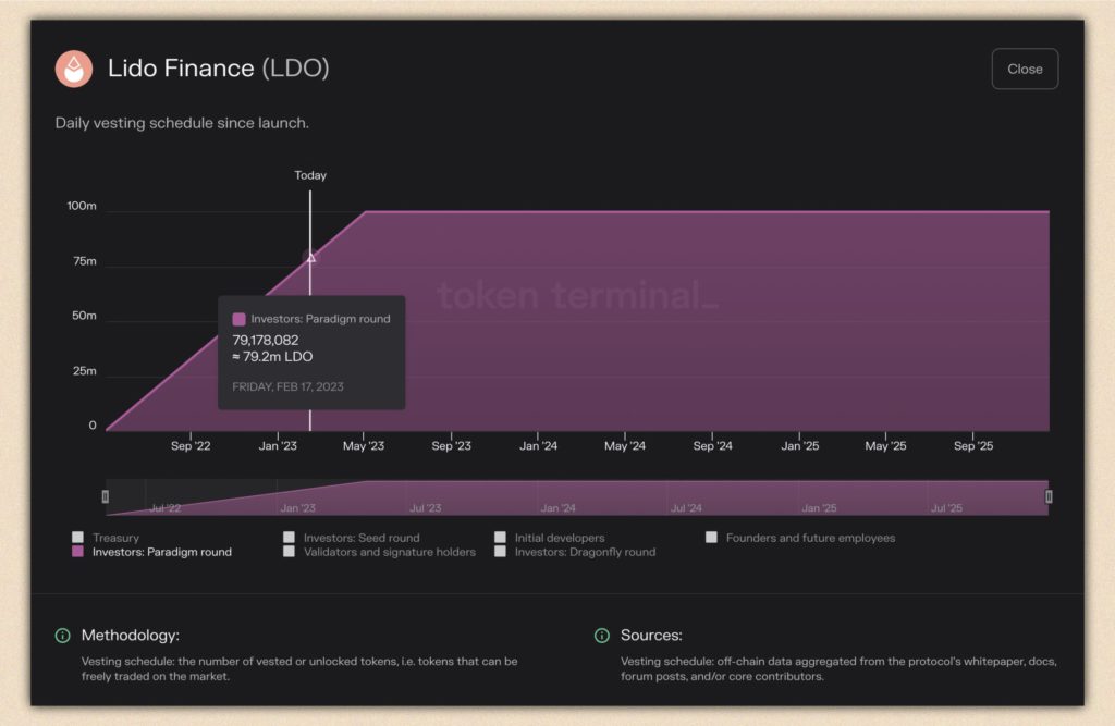 有趣的是,Paradigm 是 Lido Finance 的最大投資者之一。截至目前,他們的 1 億 LDO 代幣中有 7900 萬已解鎖(2023 年5 月1 日完全解鎖)。