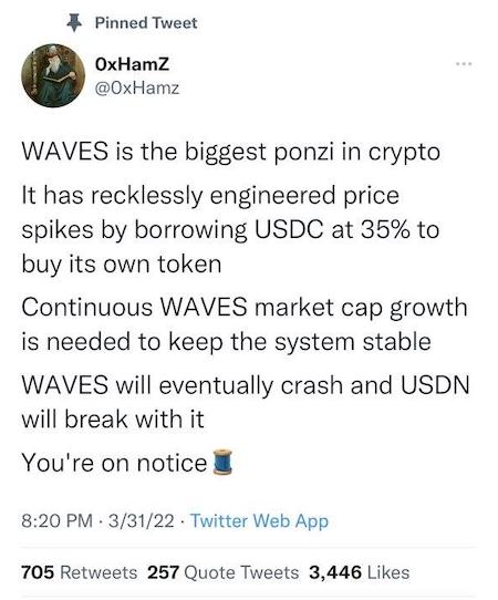 Ivanov 接續在推特上表示,隨著代幣價格的成長,在三月第三週開始,他注意到市場上出現對價格上漲不滿且想做空 $WAVES 的用戶與聲音出現,並藉由以下貼文引爆: