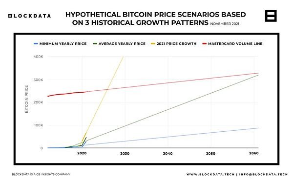 如果比特幣的價格上漲約 260%,達到 24.5 萬美元,那麼理論上比特幣網路每天處理的交易額將與萬事達卡網路相當。要達到 Visa 的交易量水平,它需要增長 540%,即約 43.5 萬美元。