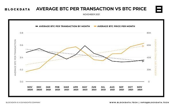 雖然這在理論上是可能的,但目前沒有明顯的上升跡象可以表明每筆交易發送的比特幣數量在增加。隨著過去一年比特幣價格的大幅上漲,我們實際上看到了價格與每筆交易的比特幣數量是負相關的。