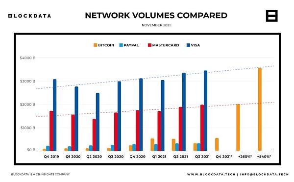 據 PayPal、萬事達卡和 Visa 的交易額季度報告,以及 BlockchainCom 以美元計算的比特幣交易額,我們可以得出:比特幣網路在 2021 年平均每季度處理了 4,890 億美元的交易;PayPal 在 2021 年平均每季度處理 3,020 億美元的交易;萬事達卡網路每季度處理 1.8 兆美元的交易;而 Visa 網路每季度平均處理 3.2 兆美元。