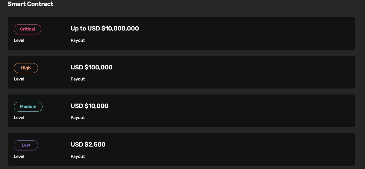 攻擊發生後,Wormhole 2 月宣布與 Immunefi 合作推出漏洞賞金計劃。其中根據威脅的嚴重程度提供不同級別的賞金獎勵。例如,低級別的智能合約漏洞獎金訂為 2,500 美元,而一個嚴重的漏洞的獎金則會是最高級別 1,000 萬美元賞金。