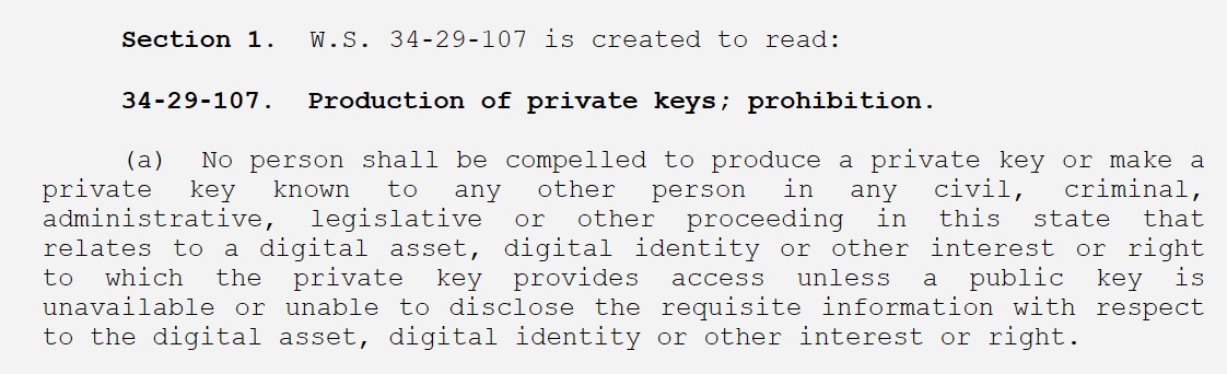 根據即將出台的法律規定,在懷俄明州,「在任何民事、刑事、行政、立法或其他程序中,不得強迫任何人出示私鑰或將私鑰告知任何其他人」。